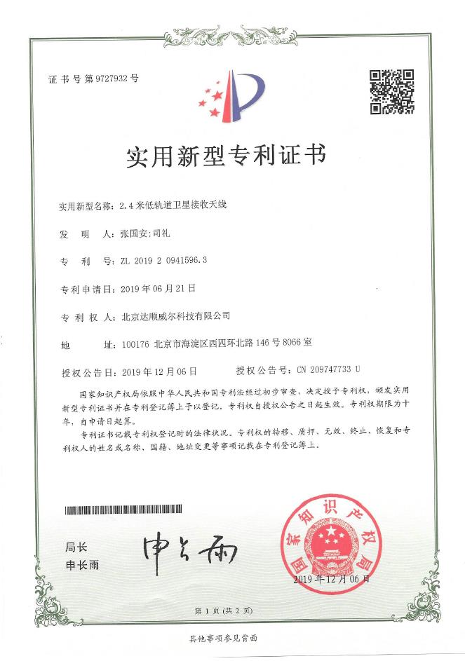 实用新型专利证书9727932:2.4米低轨道卫星接收天线